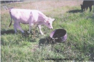 On this first morning we took the easy way and put the tubs and feed out before we turned the cattle into the paddock. The thought to use the sweet feed first was that most older cattle had come in contact with sweet feed at some point in their lives. This proved to be the case as most of the grown cattle, bull included, went to the tubs. The calves walked past the tubs without so much as a look and began to graze. After a few minutes they started to get curious and started to check out the tubs to see just what was so interesting for the grown cows.