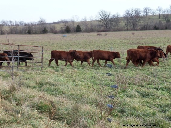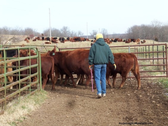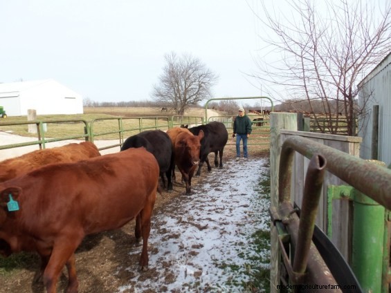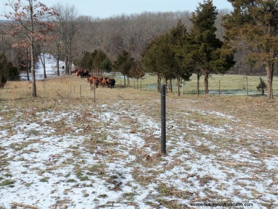 The cows were close to two miles away on this cold, grey Missouri morning. The above picture shows a new lane (and our new boss post!) we built to help bring the cows through some pretty wild country. I lead the cows and Judy brings up the rear. The cattle were full this morning and in no hurry. The cows, at this point in the drive, were spread out close to a mile. They were all walking, but some walked faster than others!