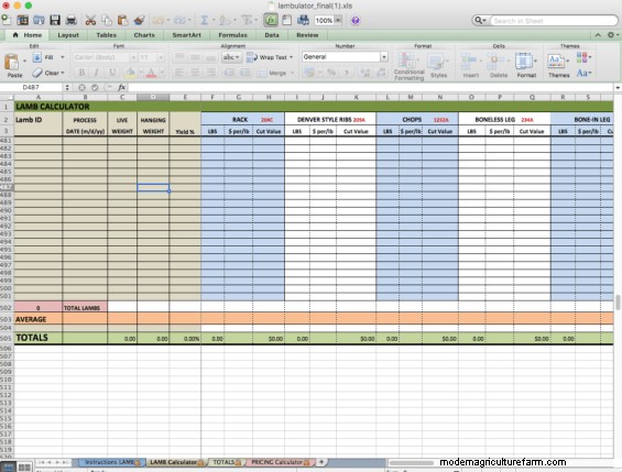 The Lambulator has been designed with the small direct marketer in mind. It is easy to understand and use, even if you have no experience with Microsoft Excel. Just plug in your cut weights and prices and let it do the calculating for you. In an instant, it will calculate carcass yield percentages, individual and average net profit per lamb, and your overall gross and net profit. It will even allow you to try different pricing scenarios should your production or marketing costs change Get started with the Lambulator today!