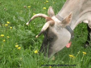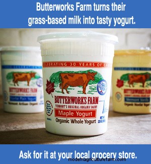 We here at Butterworks Farm have long been interested in no grain dairy farming. For the past forty years we have been grain growers as well as hay producers. Cereals (oats, wheat and barley) and row crops like corn and soy have fit neatly into our crop rotation with grasses and legumes. The straw byproduct of the grain is just as important to us for bedding our animals as the grain is for feeding them. We ground the grain into a dairy ration and fed our cows grains from our own farm as opposed to buying it from the “mill”. Over the years, as our soil health and fertility has increased, we have improved the quality of our forages (grass and legumes) to the point where we have been able to reduce the amount of grain fed to our cows to 4 ½ pounds at each milking. Standard fare on most high production dairy farms is one pound of grain for every three pounds of milk produced. Our ratio was closer to 1:5.