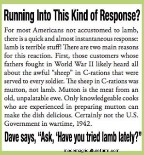 Dave starts by describing the kind of lamb customers like best and how to make sure your lamb is finished. Then, since a good product can be ruined by bad processing, Dave describes how to find a good processor, how to reduce pre-slaughter stress, proper aging to get the tenderest meat, and cutting and packaging.