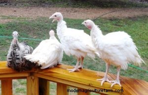 This turkey is considered an ornamental bird because of it’s small size with Toms weighing 16 to 22 pounds and hens at 10 to 12. According to Wikipedia, they first appeared in Lake Worth, Florida and were likely a cross between Black, Bronze, Narragansett and native turkeys. Selective breeding then stablized their coloring, which is largely white with bands of metallic black. Toms are non-agressive and hens are very good mothers. Hopefully this will help them survive as they are considered endangered by the Food and Agriculture Organization of the United Nations.