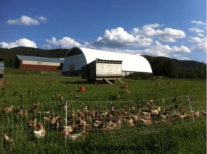 The biggest advantage to these shelters has been labor savings. It takes 2 people 10 minutes to move 500 birds with these shelters, which includes feed out and water check. By contrast, chicken tractor moving for the same amount of birds takes, on average, 35 minutes for 3 people. And during those inclement days when birds in chicken tractors can get damp and cold, the mobile shelters ability to protect the birds from weather and hold in heat makes a big difference. Last May, when we experienced a late snowfall with high winds, the birds remained dry and relatively warm. In the past, a rogue storm like that has spelled disaster for our flocks out in the tractors.