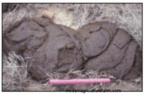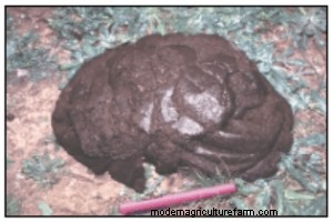 This dropping indicates a forage crude protein level between 10 percent and about 17 percent and a digestibility of 61 percent to 67 percent. Notice the slight crater-like appearance in the surface of this sample. In the 10 percent to 13 percent crude protein range, small folds may be present in the dropping. Supplementation, or the addition of protein and energy to the diet, is not required for mature cows. Forage, which creates droppings like this, should support 1 pound to 1.5 pounds average daily gain on heifers and steers.