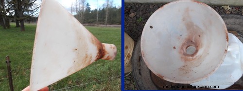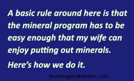 The remainder of this article is about overcoming the technical problems associated with providing minerals in a managed grazing program. Basically, the minerals need to be moved frequently, and this means they have to be light, mobile, easy to move, and also overcome the weather problems in a our environment. Also, we would like our animals to have constant access to free choice minerals, and a basic rule around here is that the mineral program has to be easy enough that my wife can enjoy putting out minerals. Here’s how we do it.