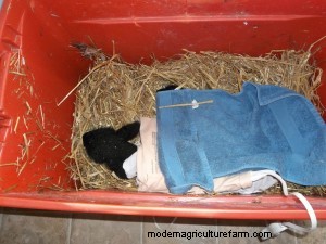 The key to this whole procedure is a warming box. The warming box is a contraption that can be simple or complicated, as long as it provides a constant, gentle heat to the lamb. I have rigged up hair dryers blowing into dog crates. Some pasture lambing operations use insulated coolers with hot water bottles. The main thing is that you don’t want to heat the lamb directly; just keep it in a very warm and dry environment. Heating a lamb too fast can be just as lethal as leaving it cold.