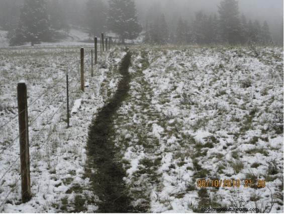But it needn’t be that way. If we learn how to settle our cattle properly they will be happy and content where they are and won’t walk the fence. This is the same 3/4 section pasture (left side) as depicted in Figure 1 after 384 yearlings had been in there for three weeks. Notice that there is no evidence of fence walking. The difference is that in the intervening four years the handlers realized the importance of settling cattle after a move and learned how to do it.