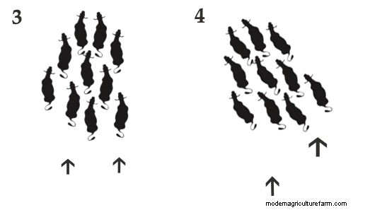 If there’s more than one handler – lets say two – and you’re driving a herd straight ahead (3) and want to turn left, the person on the left backs off a little to release pressure while the person on the right continues to pressure (4), or pressures a little harder depending on how fast or sharp a turn you need to make. This works for the same reason articulated above: The faster moving right side of the herd bends around the slower moving left side.