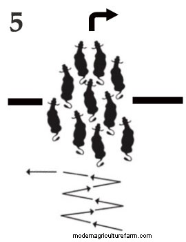 A third way to turn a herd from the rear is to walk or ride straight out to the side at a 90° angle to the direction of travel as in Figure 5. This applies enough pressure on the lead animals to turn them in the opposite direction. Who would ever guess that riding away from animals will turn them in the opposite direction from you. It took the genius of Bud Williams to figure that out.