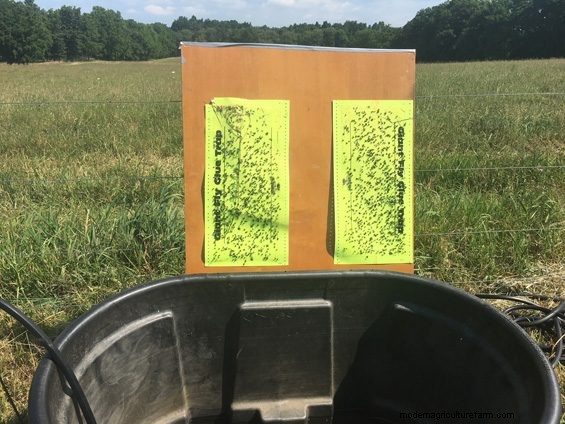 That first trap was frustrating to construct with all that sticky stuff. I immediately commenced a search for “wide” fly paper and found the same (CatchMaster) brand) fly paper utilized on the barrel in previous article. Attaching to the board I dubbed the “cartridge” as it is replaceable, was still slow, mostly trying not to stick to itself or me. It was however quite successful at capturing ~2000 flies in a day.
