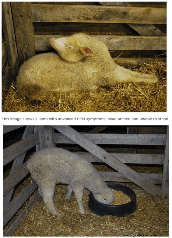 “Thiamine deficiency and/or high sulfur levels within the brain cause destruction of neurons and swelling of the brain which can be diagnosed by histological examination of brain tissue. Therefore, PEM symptoms are manifest as neurological, with early symptoms being partial to complete blindness with the head held erect. This may also be associated with unilateral (uneven) ear droop and/or unusual/exaggerated gait. It is common for the pupils to be dilated and for the eyes to tear. PEM affects animals of all ages but is most common in young lambs and kids transitioning from a milk to solid diet, and especially so in those fed a high-grain diet. PEM is also found in adult small ruminants of either sex at any age but more commonly associated with changes in diet (change in the plane of nutrition, pasture type, pasture to forage feeding, forage feeding to grain addition, etc.). PEM symptoms are similar regardless of age. Early blindness symptoms lead within hours to a day to loss of body control, inability to stand, and seizures. In more advances states, animals commonly arch their heads back as far as possible. PEM symptoms may present itself similarly to listeriosis and even ketosis. However, thiamine therapy is relatively benign, so it is best to treat with thiamine as a precaution.”
