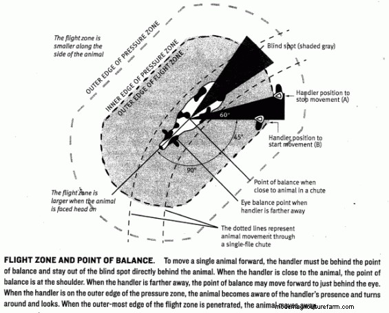 A couple decades ago we began reading about Dr. Temple Grandin’s work. She showed the importance of using angles of approach, body language, aspect and flight zones.