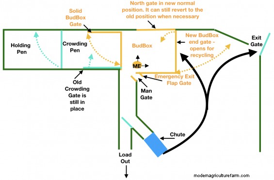 Last spring, I opened the end gate at my main processing center and added a few panels, constructing a crude BudBox. Throughout the season I tinkered with the box, moving the panels to change width, depth, and angles. Throughout the season I learned a bit and improved my herding skills. In the end, I settled on a design that looks like this. You can see the changes I made in yellow/orange: