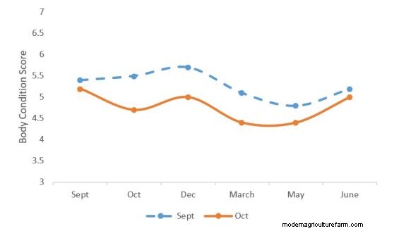 Data from the Gudmundsen Sandhills Laboratory Practicum teaching herd illustrates how the time of weaning affects cow Body Condition Score (BCS) over the winter and into the next summer. (See the graph below.) By weaning in September, cows maintained almost an entire BCS greater than weaning in October. This can be especially important if we have a wet and cold winter like 2018-2019. If it gets cold enough, there may be times producers cannot feed enough to give cows the energy needed to withstand the cold. In periods like this, cows lose body condition to offset an energy-deficient diet. Body condition scoring is an effective management tool to estimate the energy reserves of a cow, and in essence, cows with a BCS of 5 or greater going into the winter are an insurance policy or risk management tool.