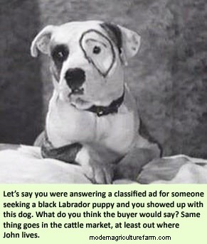 “Here’s the thing, John. They’ve tightened down on me some more. From now on, no spots or stripes, no roans, no horns, no rat-tails, no snake-bellies, no dairy blood, no brindles, no shorts, and for goodness sake, no miniatures. Oh, and no more than a tiny tic of ear. Bulls are still OK, but they better be pretty young. European genes are fine, but try to hold it down to half-bloods. Oh, and no, uh, ‘goofy-looking’ calves either.”