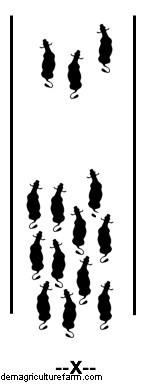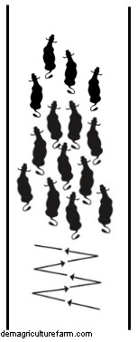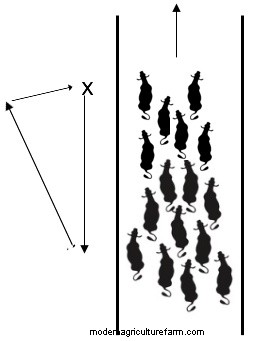 If there are two people driving animals up an alleyway they should each stay close to the fence and zigzag behind the cattle in front of them. That keeps the animals going straight down the alleyway and not wanting to turn back (see Figure 4).
