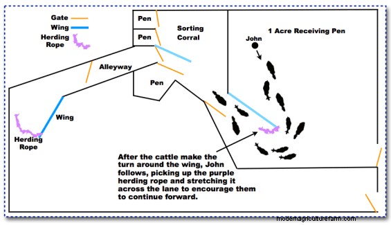 Now that you know how it works, here’s a video showing the system in action with a few cows I recently purchased. You can see them walk down to the end of the wing, make a turn and then I follow, picking up the herding rope as I go to encourage them up the alleyway.