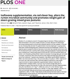 Red Clover contains an isoflavone called biochanin A. In lab tests biochanin A prevented HAB from growing. It also promoted cellulolytic bacteria. Those are the bacteria that break down all the cellulose in the grasses and other forages ruminants eat, converting them into usable sugars. Knowing this about biochanin A, the next step was to test it in actual feeding trials. Researchers found that animals fed biochanin A while grazing on pasture gained more weight than those without: 2 pounds a day compared to 1.5 pounds a day.