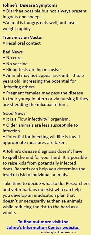 The disease is also known as “paratuberculosis” because of the mycobacterium that causes it. Infected animals shed the mycobacterium in their feces at random times, but in highest quantities when they are sickest, just before death. Animals become infected by eating off the ground in areas contaminated with feces containing the mycobacterium. Young animals can also be infected through mother’s milk if the doe is shedding the mycobacterium. Johne’s is considered a “low-infectivity” organism because animals must ingest a large quantity before becoming infected. Young animals are very susceptible to contracting the disease, but older animals are unlikely to become infected unless they are housed in “feedlot” type conditions where the bacteria can be concentrated.