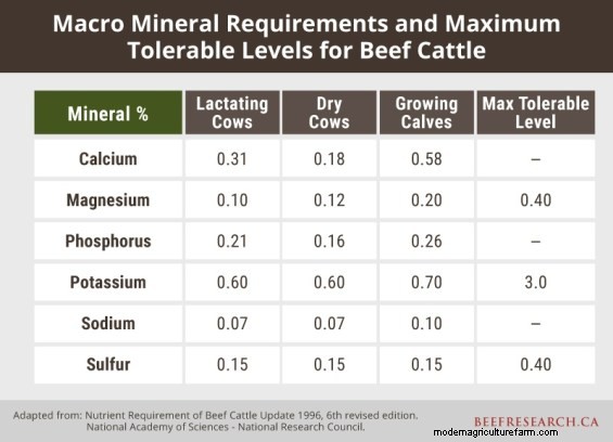 The seven macrominerals required by cattle are calcium (Ca), magnesium (Mg), phosphorus (P), potassium (K), sodium (Na), chlorine (Cl) and sulphur (S). Macrominerals are required in amounts over 100 parts per million (ppm) and are often expressed on a percent (%) dry matter (DM) basis of the animal’s diet.