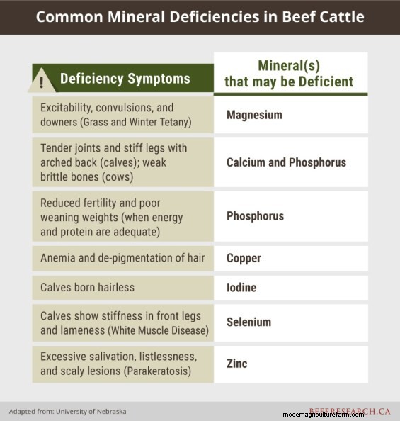 Other problems that can arise due to mineral deficiencies include grass and winter tetany, white muscle disease, weak bones, hairless calves, goiter, scours, foot rot, retained placentas, low weaning weights, and reduced fertility.