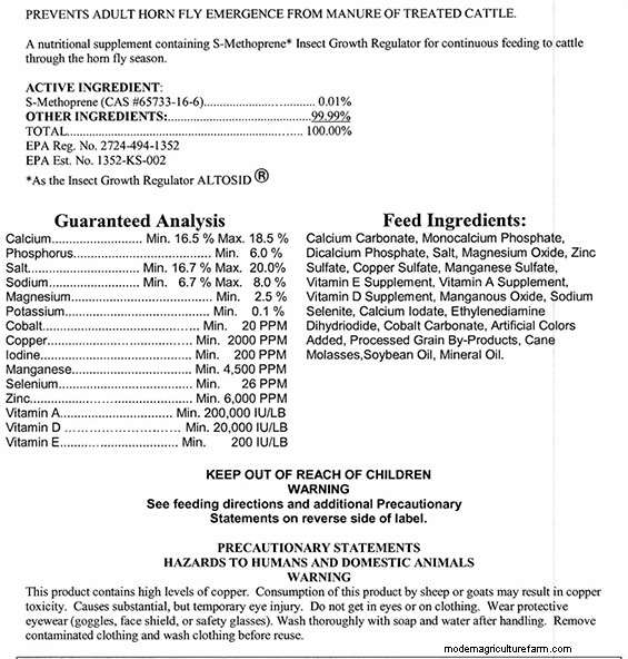 The following label contains the breakdown of a loose mineral that would be considered a 3:1 calcium to phosphorus ratio and may be used by producers feeding cereal greenfeed forages. (Please note the warnings about copper, both for sheep and goats, and for eye injury.)