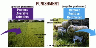 The other way to get either two or four-legged livestock to do something is to punish them. Positive punishment is the presence of something the animal doesn’t like. An electric fence is an excellent example of positive punishment. The fence decreases the likelihood that the animal will leave its pasture or touch the fence again. Negative punishment is the removal of something that an animal does want. For example, when a ewe walks away every time its lamb tries to nurse during weaning, it is removing something the lamb wants and the likelihood that the lamb will continue trying to nurse decreases.