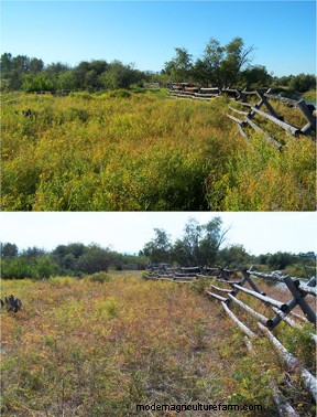 What I’ve learned since I first trained cows to eat leafy spurge in 2004, is that Young is absolutely correct about the importance of mixing forages when it comes to getting cattle to successfully eat leafy spurge. In 2004 I trained a small herd of heifers (and one steer) to eat leafy spurge as part of my first effort to figure out the steps to teach livestock to eat new foods. They ate leafy spurge well in training, and suffered none of the harmful side effects listed above. When I took them to pasture, I found that in pastures with more variety (grasses, thistle, goldenrod, knapweed, wild roses, and small brush) the cattle ate much more leafy spurge than in of primarily grass. In another training in Montana, in a pasture that was primarily leafy spurge with a small amount of grass, that cattle ate much less leafy spurge.