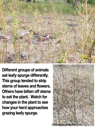 When I first started teaching cows to eat weeds in 2004, I had heard a lot of the same information that you may have heard. Sheep and goats can eat it but cows can’t. The sap can cause irritation or burning in the mouth and digestive system, skin irritation and diarrhea. This basic sentence is included in most texts on leafy spurge. On the other hand, I knew that cows on the Rex Ranch in Nebraska were eating spurge. Ranch Manger John Young said they discovered this after marking spurge to be sprayed once the cattle had been moved to a new pasture. When they returned, the spurge was grazed to the ground. Young thinks that their high-intensity, short duration grazing system may have encouraged the cattle to try the weed, and since it doesn’t grow in monocultures there, cows can mix it with other forages, reducing any potential harmful effects.