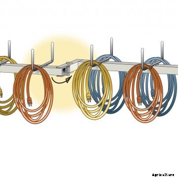 Michael Blake of Aurelia, Iowa, built the arms for this rack from two 34-inch lengths of 1-inch tubing. Pivot points are welded out of strap steel, and ½-inch bolts secure the pivot points and the rack to the shop wall.