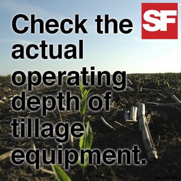 Check the actual operating depth of tillage equipment by digging into the field in several locations across the entire width of an implement. Dig down to the bottom of disks and sweeps with the implement at rest but still in the soil to determine operating depth.