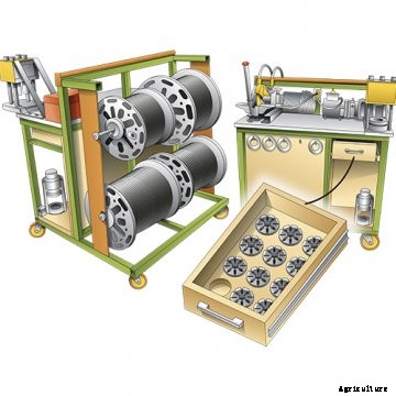 “It’s also sized so I can drive the forklift under it, slide it into a pickup, and take it to the field,” comments Elliott. An inverter on the truck will run the press, he says. The cart also holds a completely portable, smaller hose press.