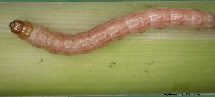 Apply Carbofuran 3G, Carbaryl 5G at 12kg/ha in the leaf whorl three times at 20, 30 and 40 days age of the crop.