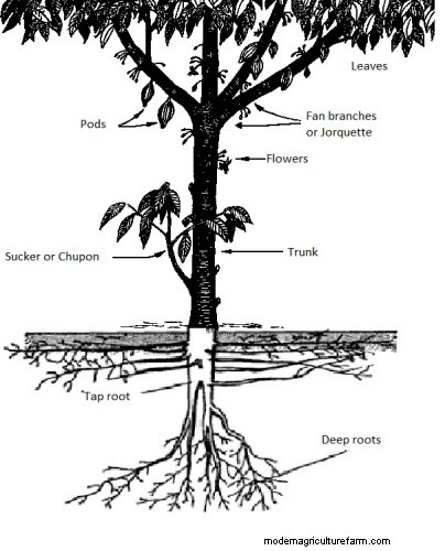 A mature cocoa tree is made up of a tap root about 120 – 200cm long. The root system also has lateral feeder roots found in the topsoil. It may go down about 40-50cm where the humic layer is deep. These lateral roots can grow very far from the tree canopy to form something like a woven mat. The farthest part of the taproot divides into small rootlets which absorb water and nutrients. Selecting good sites with deep soil enhances root formation.