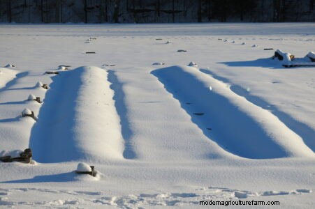 Snow-covered garlic mounds endure deep winter freezes.