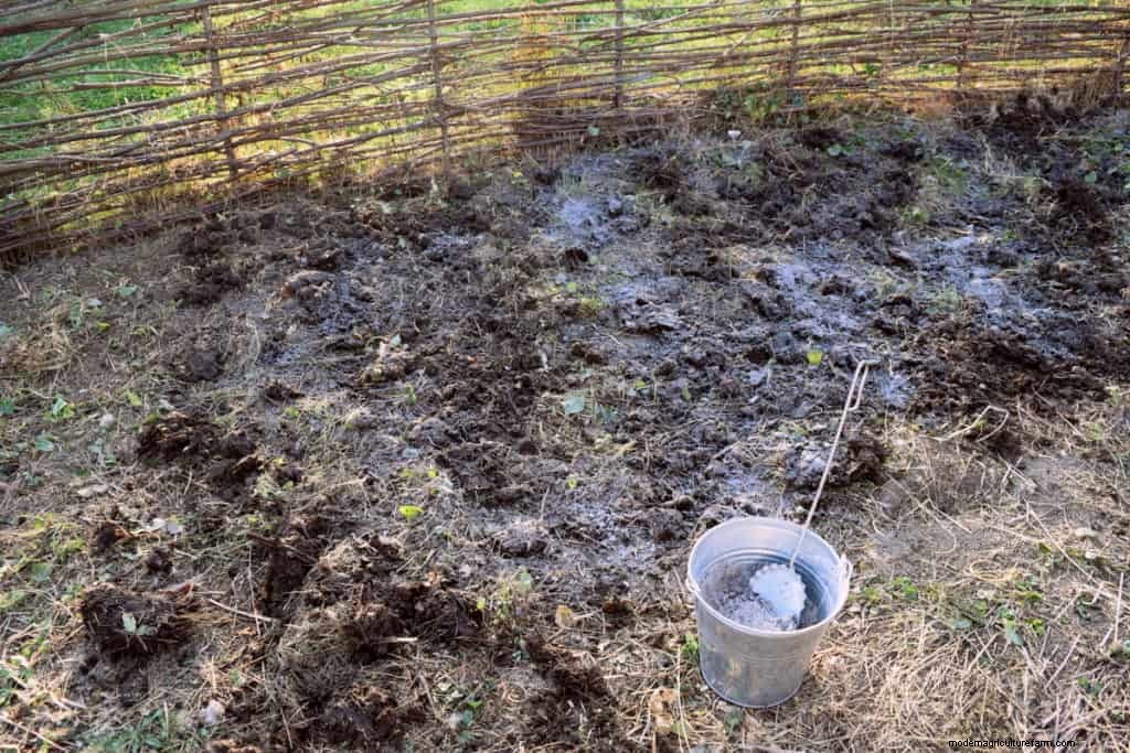With a small shovel, sprinkle a small amount over the manure, then be sure to cover it with another layer of mulch.