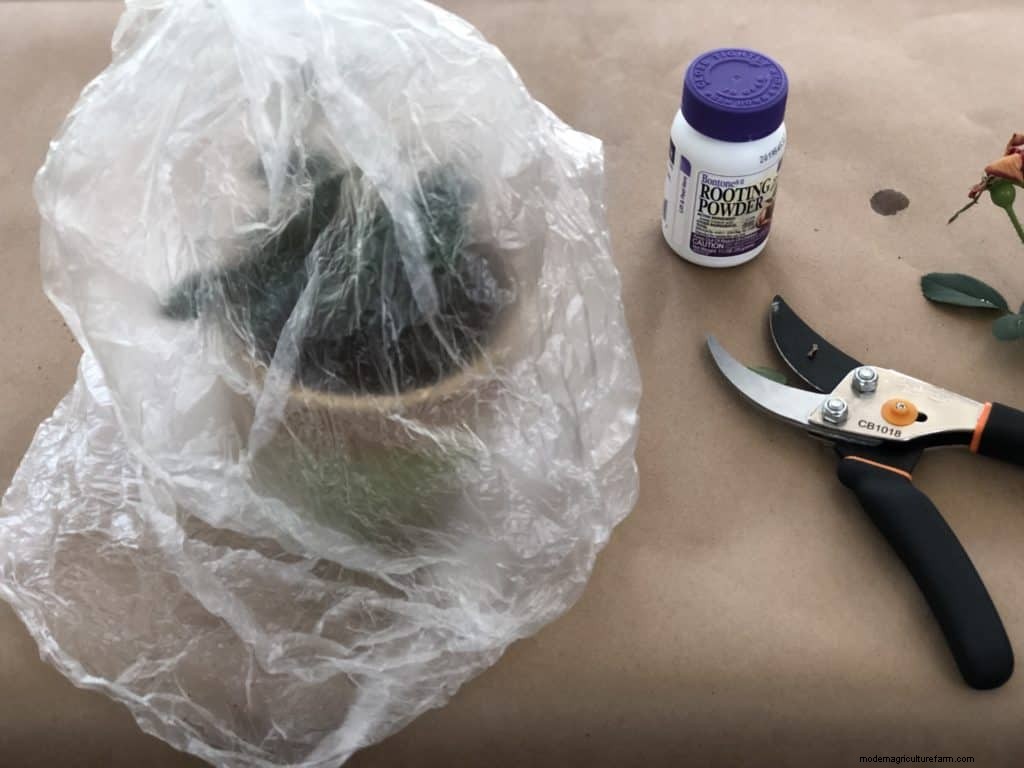 Cover your rose with the plastic bag for at least two weeks until roots form.