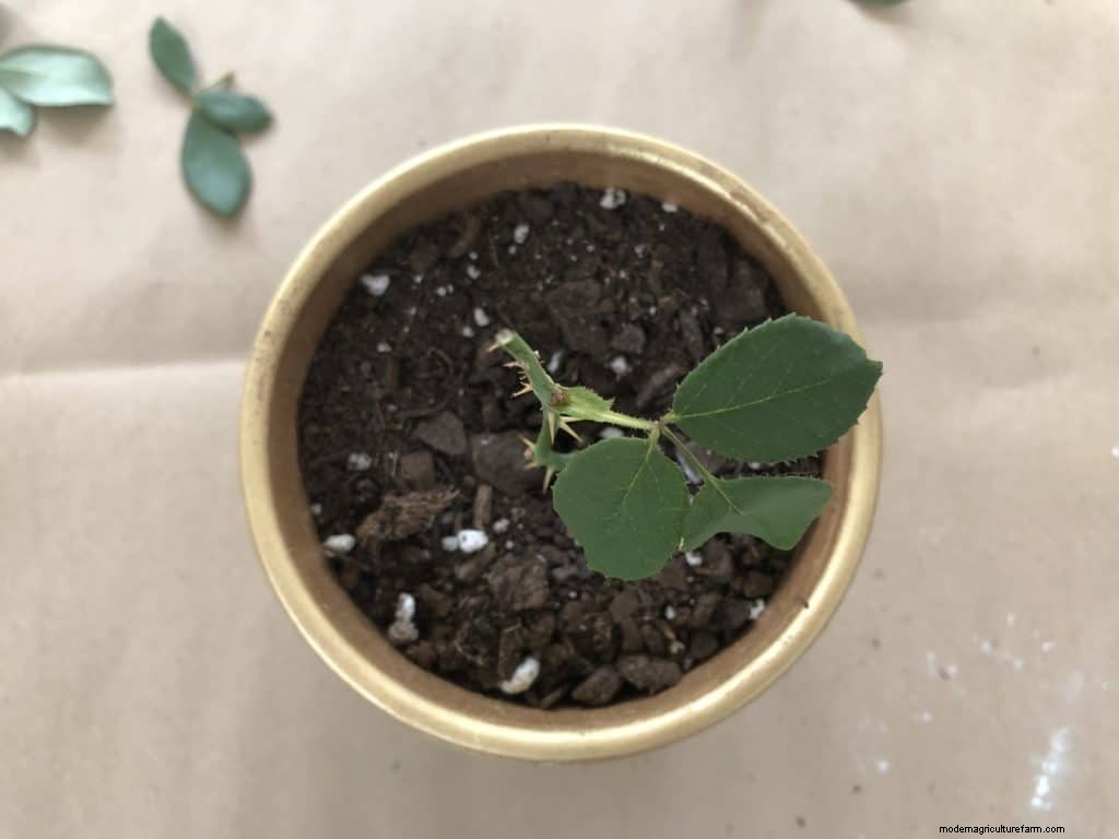 Fill up a flowerpot with potting mix. Use a pencil or chopstick to make a hole and insert the rose stem. Water thoroughly using a watering can.