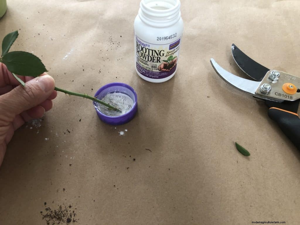 Dip the tip of the rose cutting in water and then into the rooting powder. Rooting powder speeds root development and will help the rose cutting form roots faster than if you used none at all.