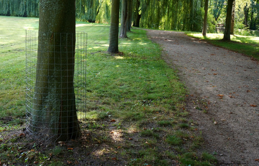 For larger trees, this can be accomplished by creating a small fence around the trunk with galvanized wire mesh, leaving around 3-inches of space between the mesh and the trunk. As with the garden fence, you will want to bury the mesh about 3 inches around the perimeter to avoid burrowing. For small trees and saplings, you can wrap the trunk with spiral tree guards.