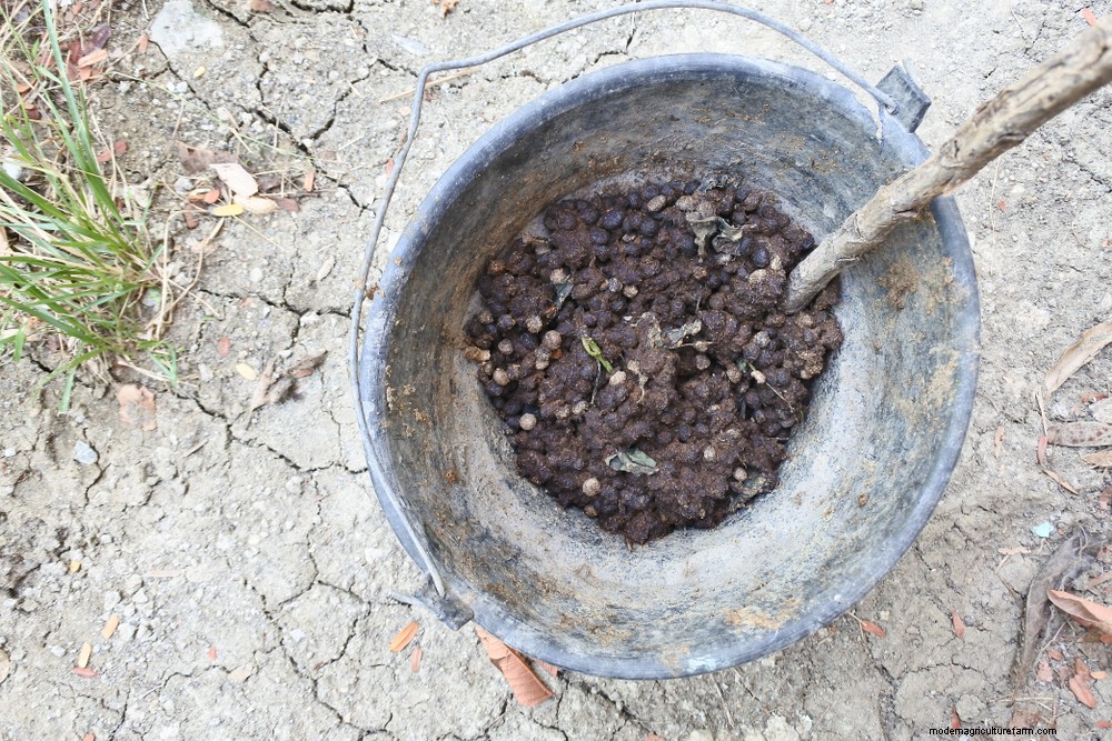 Usually deposited in small piles, you can scoop up the pellets and scatter a cup or two around each plant.