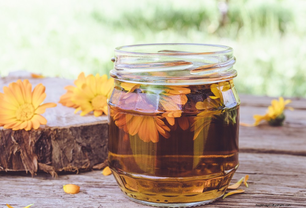 You can bring calendula’s useful properties to bear in a carrier oil. Make an infused oil by steeping the petals in olive oil.