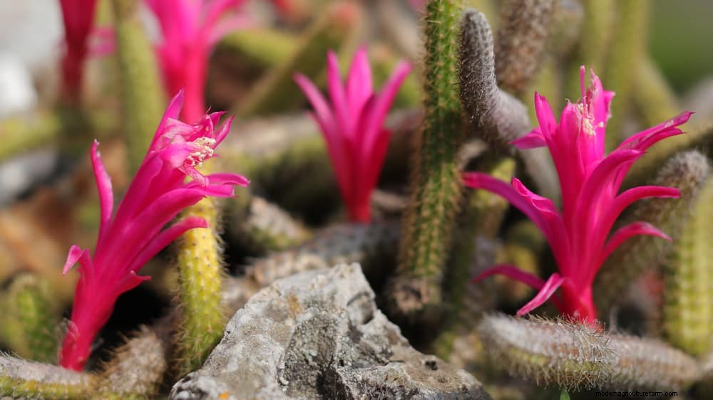 In spring, rat tail cactus blooms aplenty with tubular pink flowers, each about two inches long.