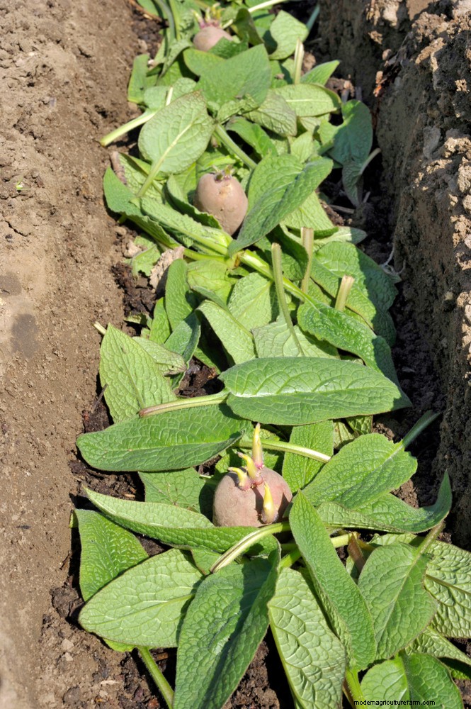 Alternatively, some gardeners like to plant their potatoes with comfrey leaves for a fertility boost, as shown below.