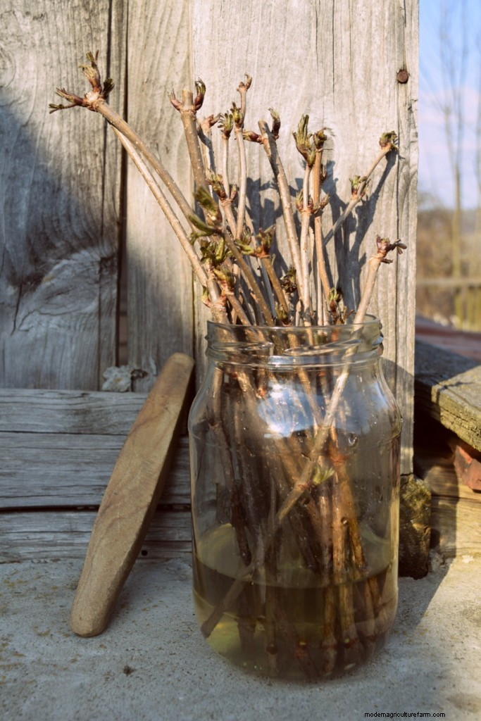 Place the elderberry cuttings, cut side down in a jar, covering them with 2-3″ of clean water. Optional, though not required, is to add one cup of willow tea to the water in the first week.