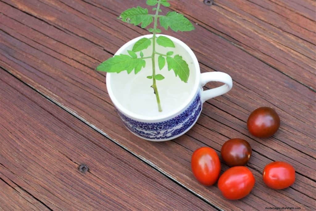 Getting a tomato plant to root in water is easy enough. You’ll need a cutting at least six inches long. Just put the stem end in a cup of water. Make sure the leaves aren’t in the water, or they will rot. Remove any leaves if necessary. You want only the very bottom of the stem to be submerged.