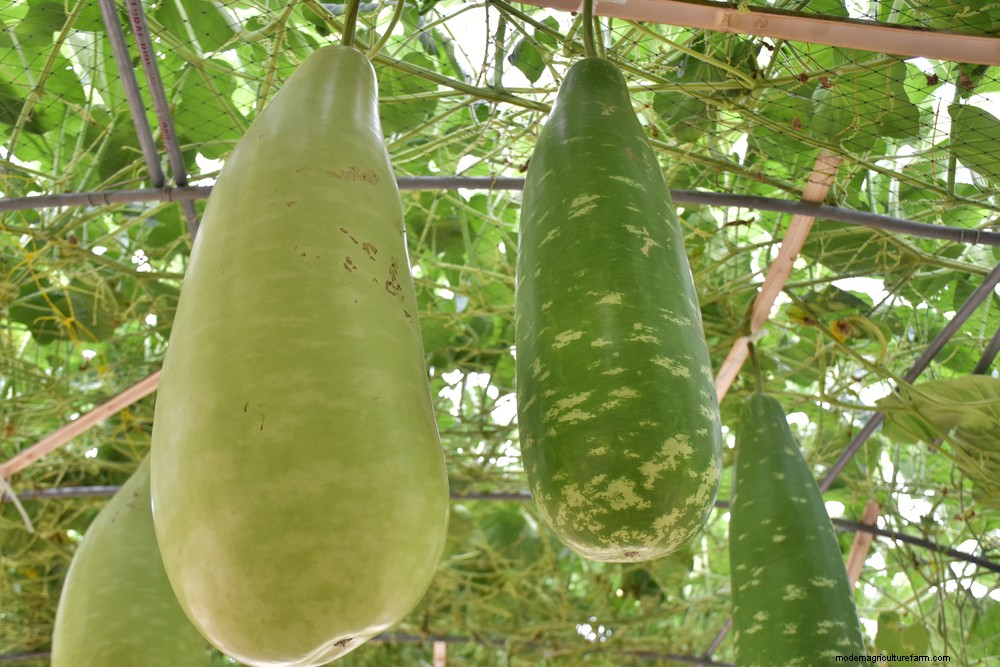 The fruits are long and green, often growing to 2-4′ or more. They are a prime candidate for trellising. When harvesting for fresh eating, you can cut off just as much as you want while it is hanging on the vine, and come back a few days later for the rest.