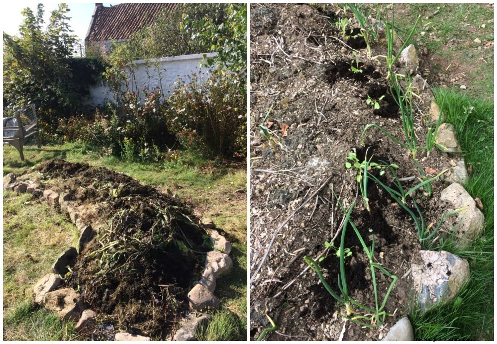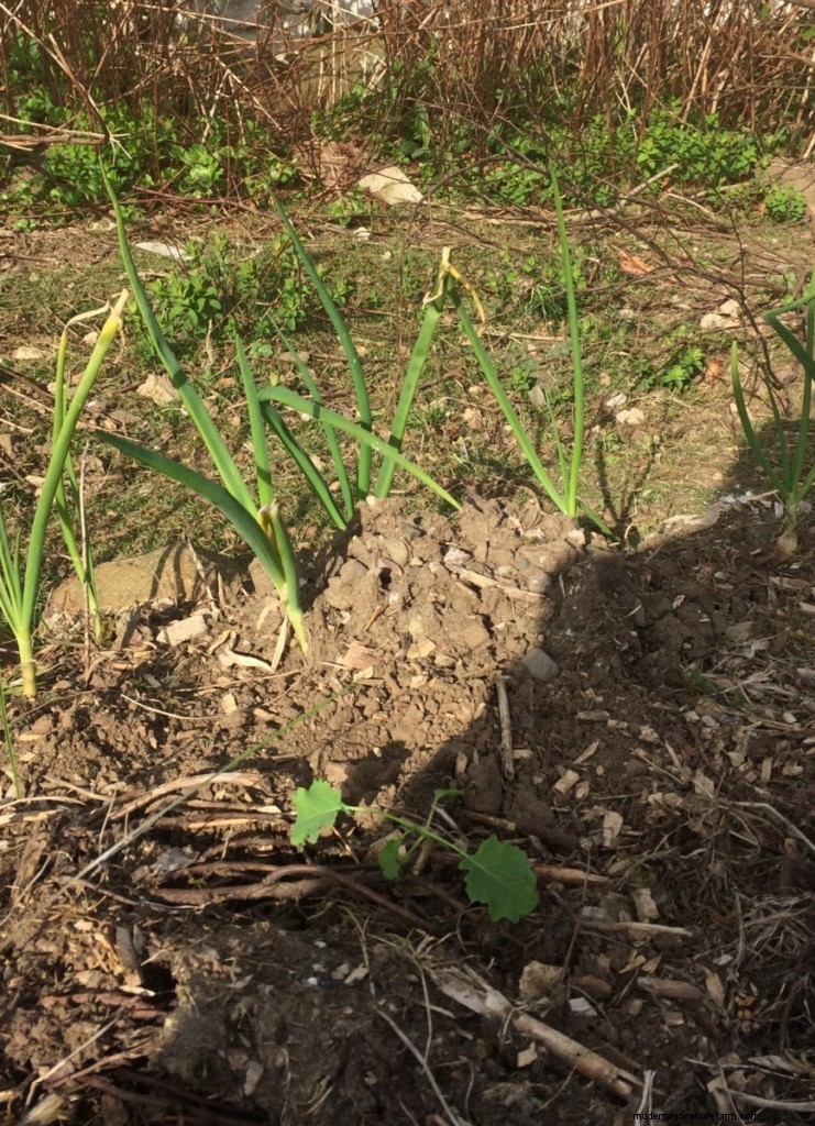 Onions are already growing strong around the edges of the hugelkultur bed.