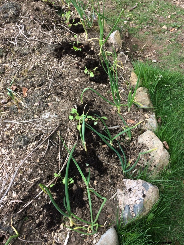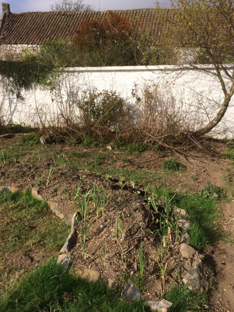 At the time, I planted onion and garlic sets around the edges. These overwintered in the bed and are now growing strong.