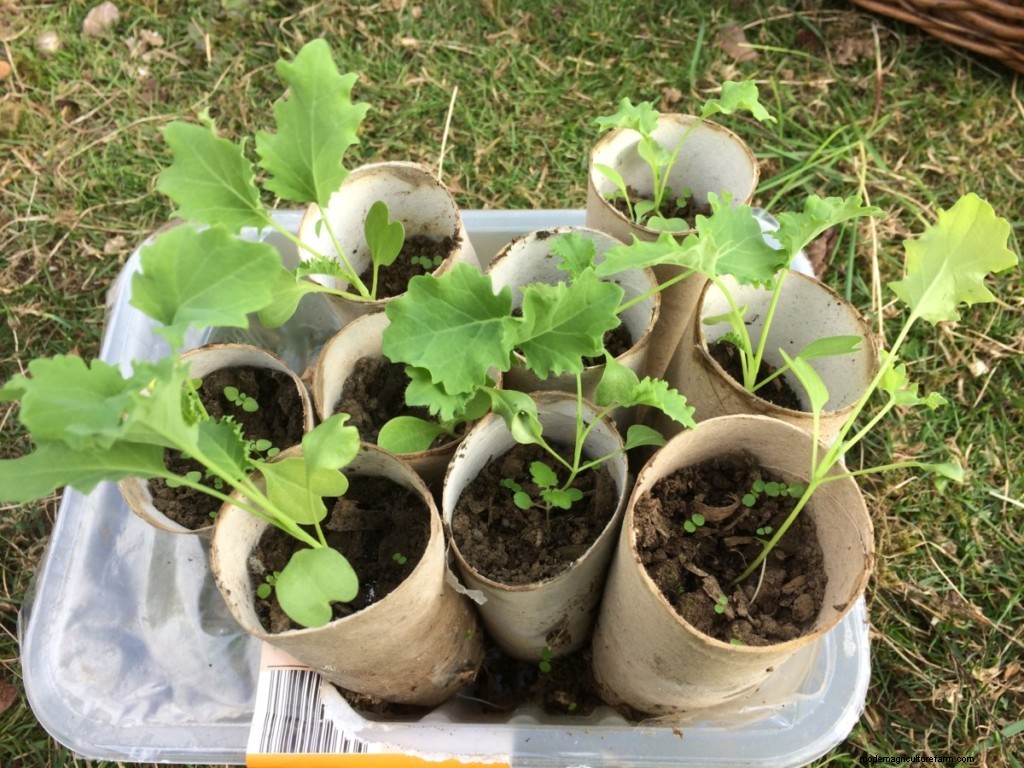 I started off brassica seedlings around 4-6 weeks ago, in a range of different containers. As you can see, I used toilet roll tubes for some of the seedlings.